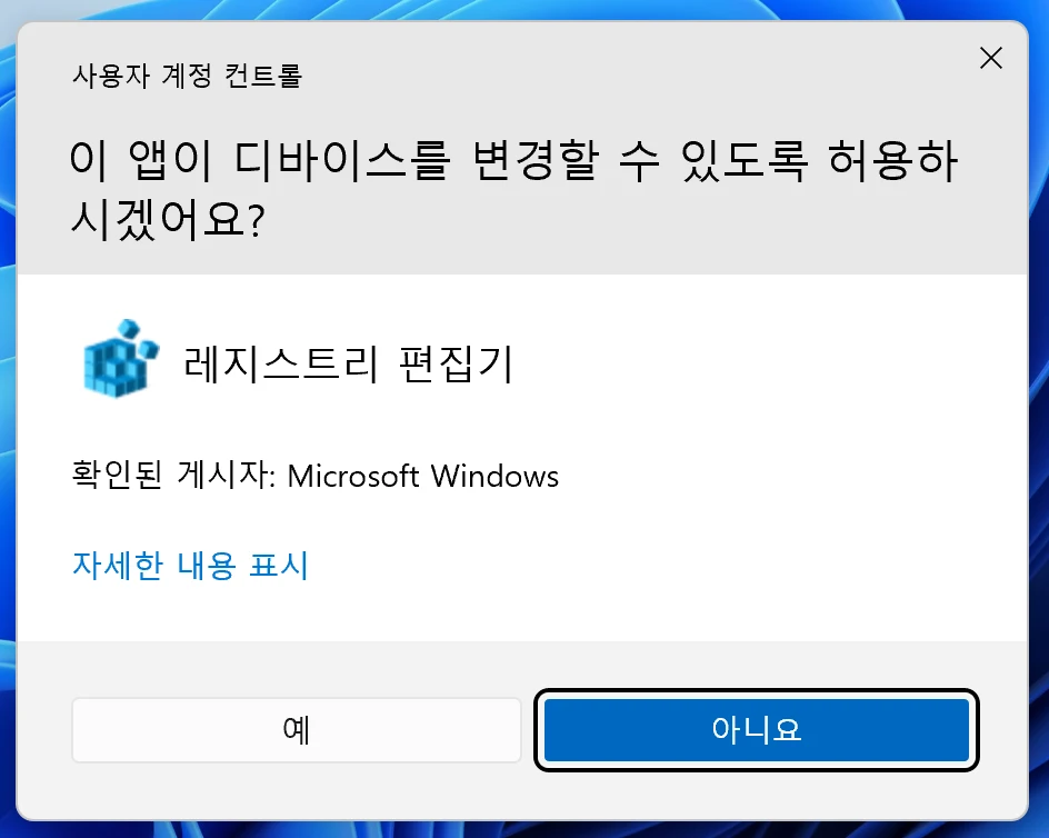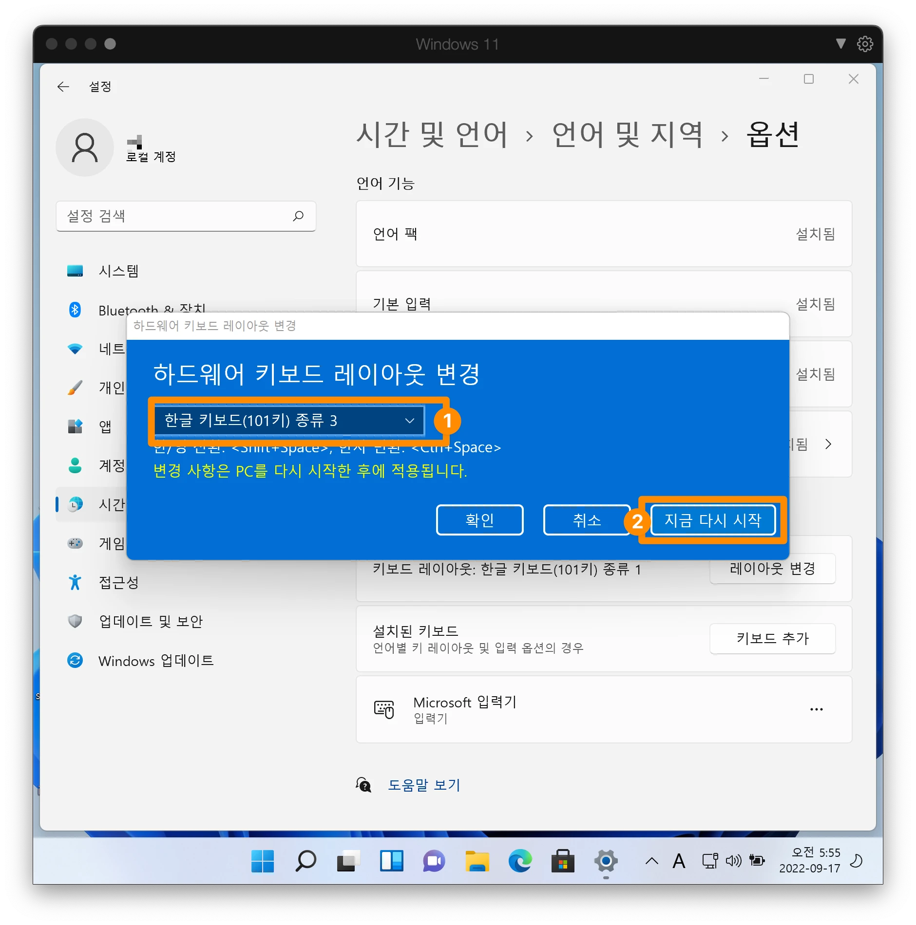 윈도우 11에서 한영키 레지스트리를 추가해주고, 윈도우 11을 재부팅해줍니다.