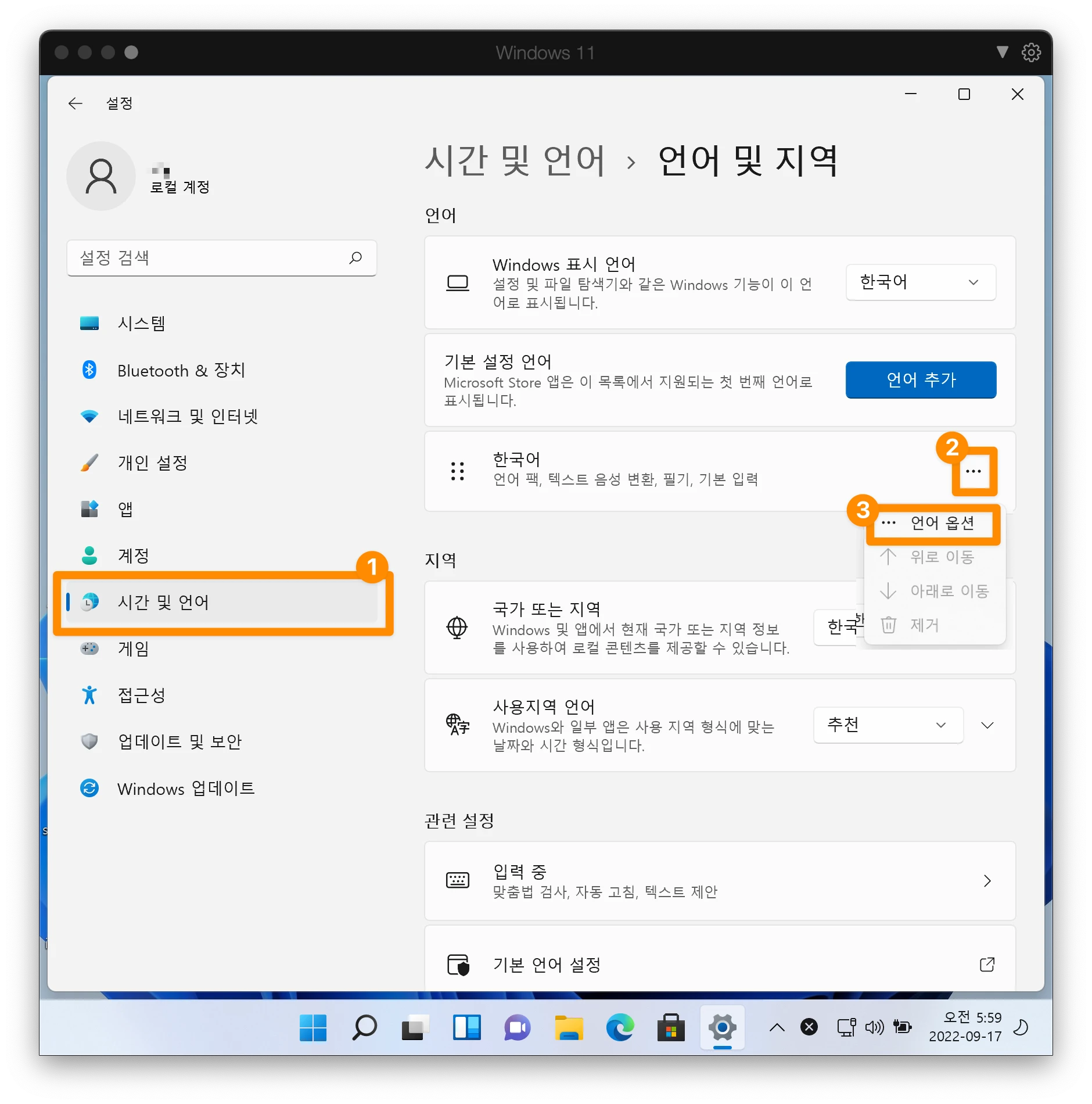 이제 패러렐즈 18의 윈도우11에서 기본 언어를 한국어로 지정해줍니다.