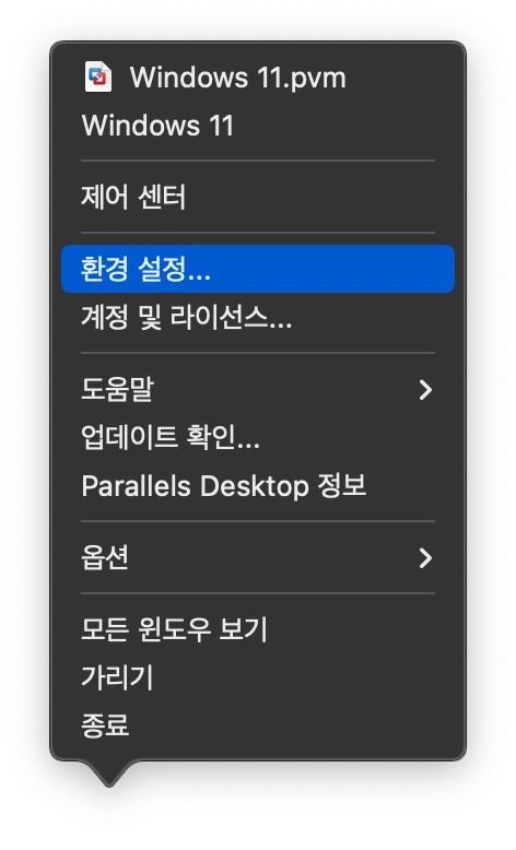 맥북 독 바 ➜ 패러렐즈 18 앱 오른쪽 클릭 ➜ 환경설정 ➜ 단축키 ➜ Windows 11 ➜ + 버튼 클릭