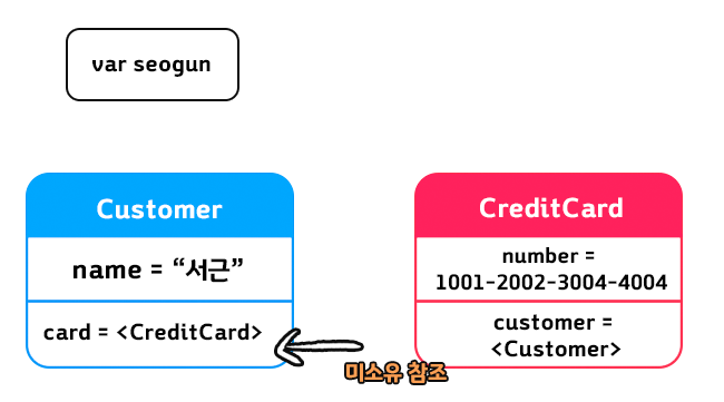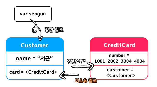 서근은 Cutomer 인스턴스에 대해 강한 참조를 가졌고, CreditCard 인스턴스에 customer에 대한 미소유 참조인 Customer가 있다.