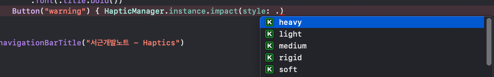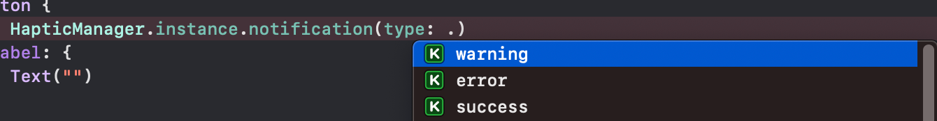 우선 notification옵션부터 확인해볼까요? HapticManager.instance.notification(type: )를 입력하고 type부분에 점(.)을 입력해보면 아래 옵션을 확인할 수 있습니다.