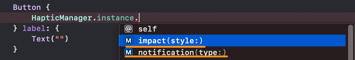 그리고 두 개의 함수를 추가해줄건데 첫 번째는 notification 함수, 두 번째는 impact 함수입니다. 이렇게 나눠져 있는 이유는 내장된 햅틱 기능이 실제로 이렇게 분리되어있기 때문입니다.