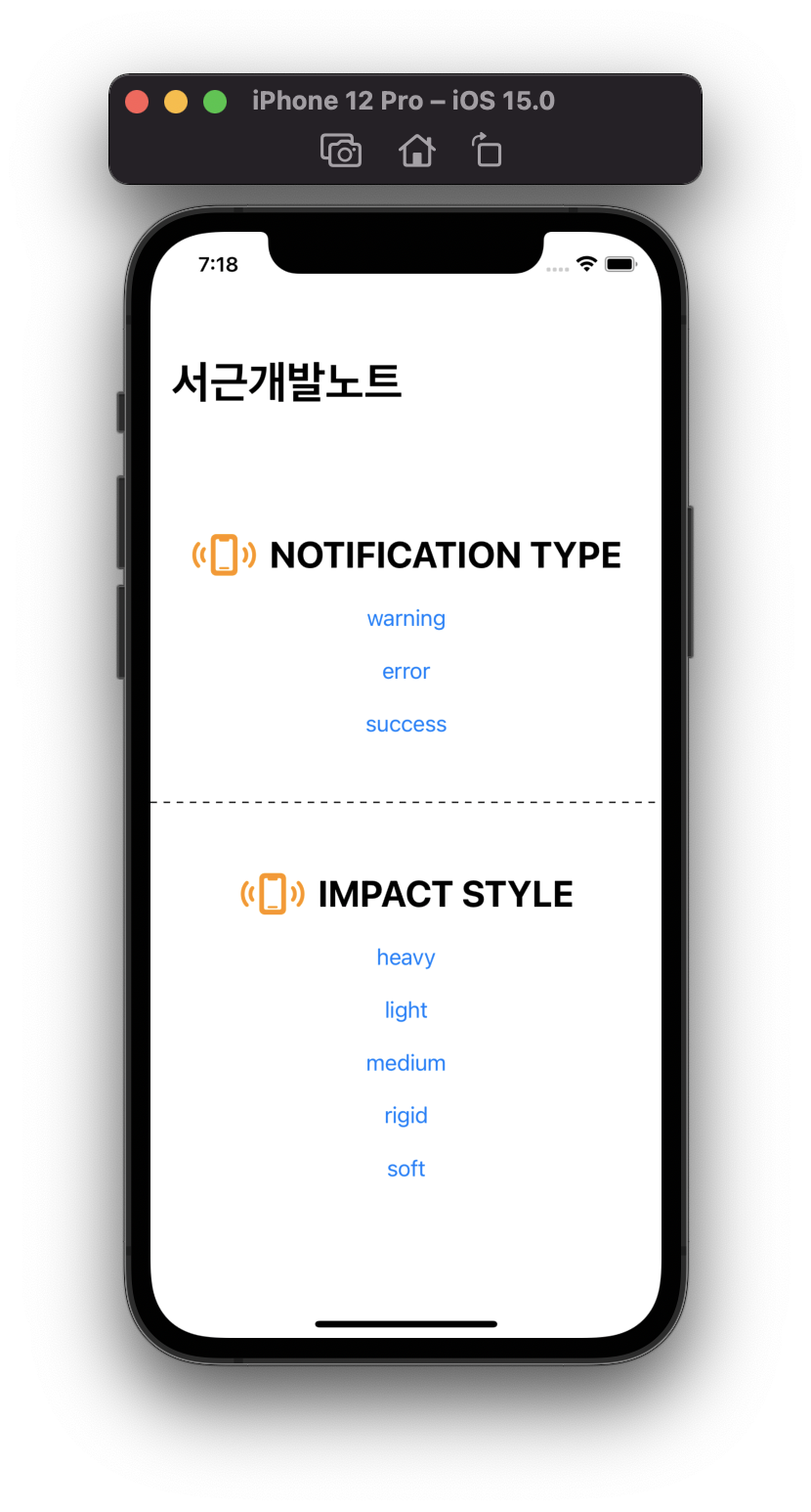 자 일단은 notification과 impact함수를 모두 생성했고, 이제 이 두 가지 스타일의 진동을 직접 뷰에 넣어보고 비교해보도록 하겠습니다.